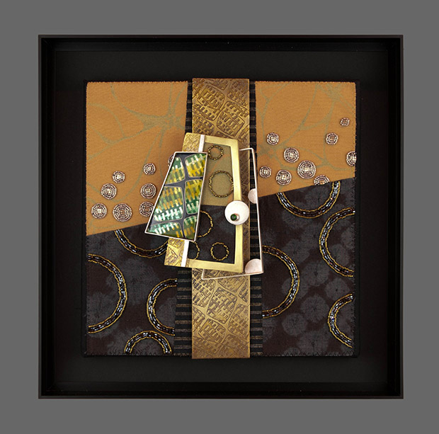 Copper, silver, enamel, fabric, chrome diopside stone.