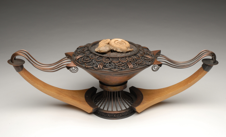 Kantharos Ammonoidea Ammonite fossil from Great Britain, copper, butternut wood 10”x24”x12”2000