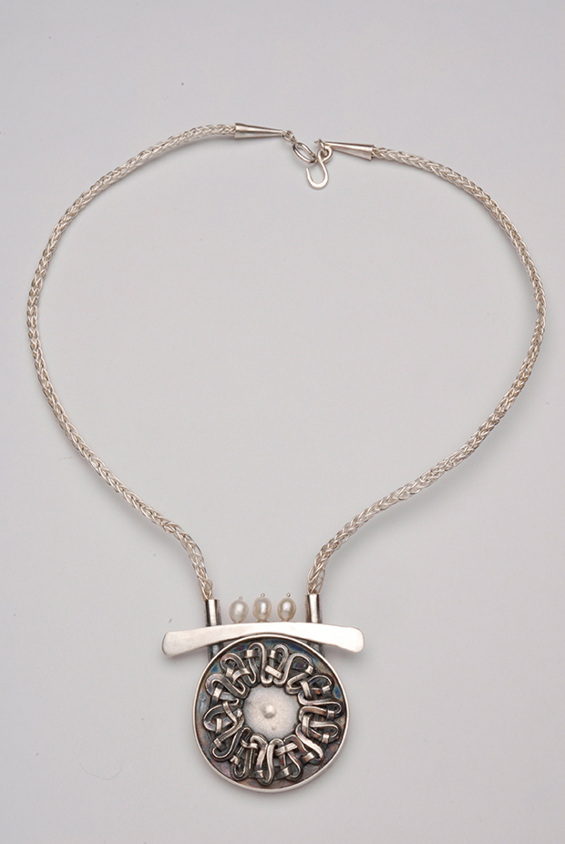 cast and forged sterling silver, pearls.